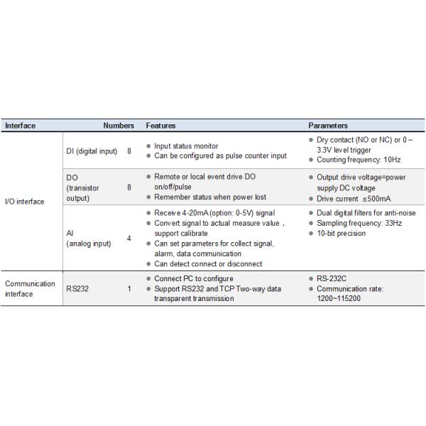 | CWT5002 | 4DI+4DO | 1 RS232(RS485 optional) | √ | √ | √ | view» |
